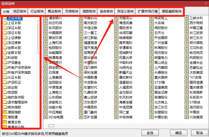 有上证A股、上证B股、深圳A股、深圳B股等板块,另外还有地区板块、行业板块等,大家按需自行选择即可。
