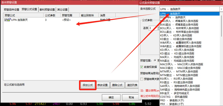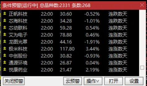 下面我以通达信自带的预警条件“连涨数天”作为买入条件,“连跌天数”作为卖出条件为例。