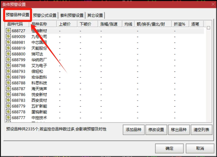进入条件设置界面后,第一步先进行预警品种设置,也就是要选择我们需要进行预警的标的池。