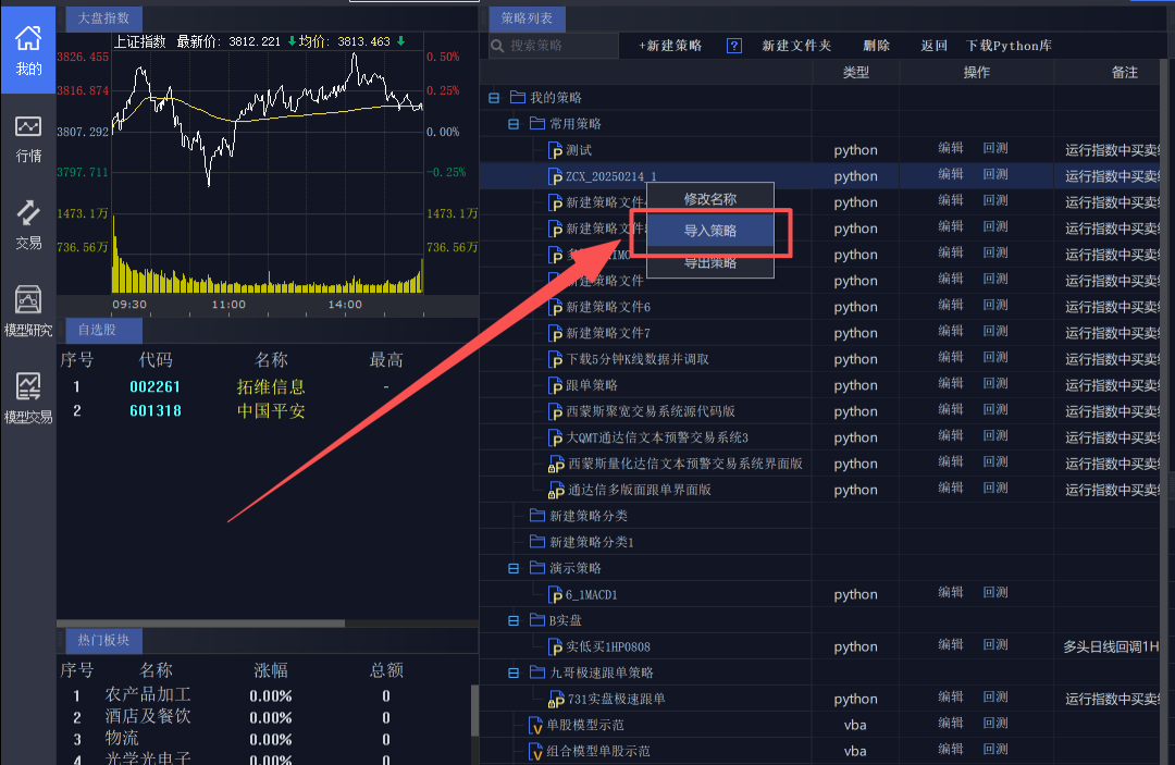 点击模型研究,随便选个策略点击右键,导入策略,选择“通达信多版面跟单界面版.rzrk”导入。