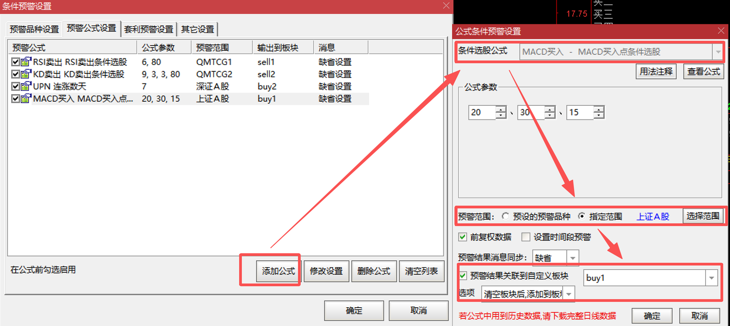 比如我这里是给“上证A股”股票池设置了“MACD买入”公式,然后把预警结果输出到了“buy1”板块,即上证A股-MACD买入-buy1