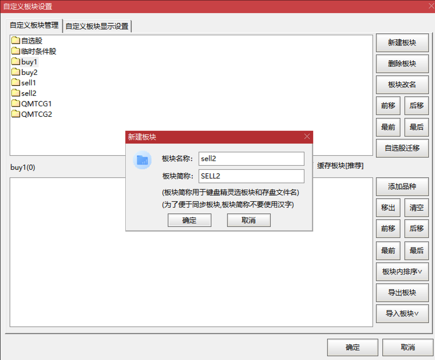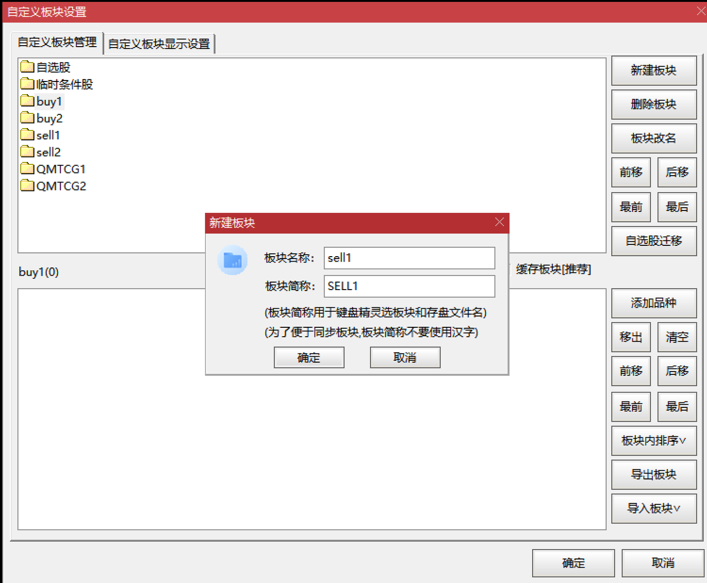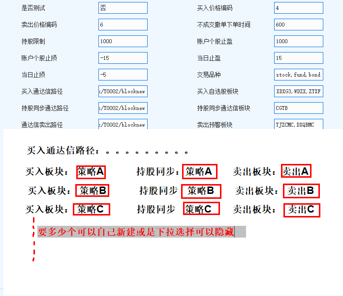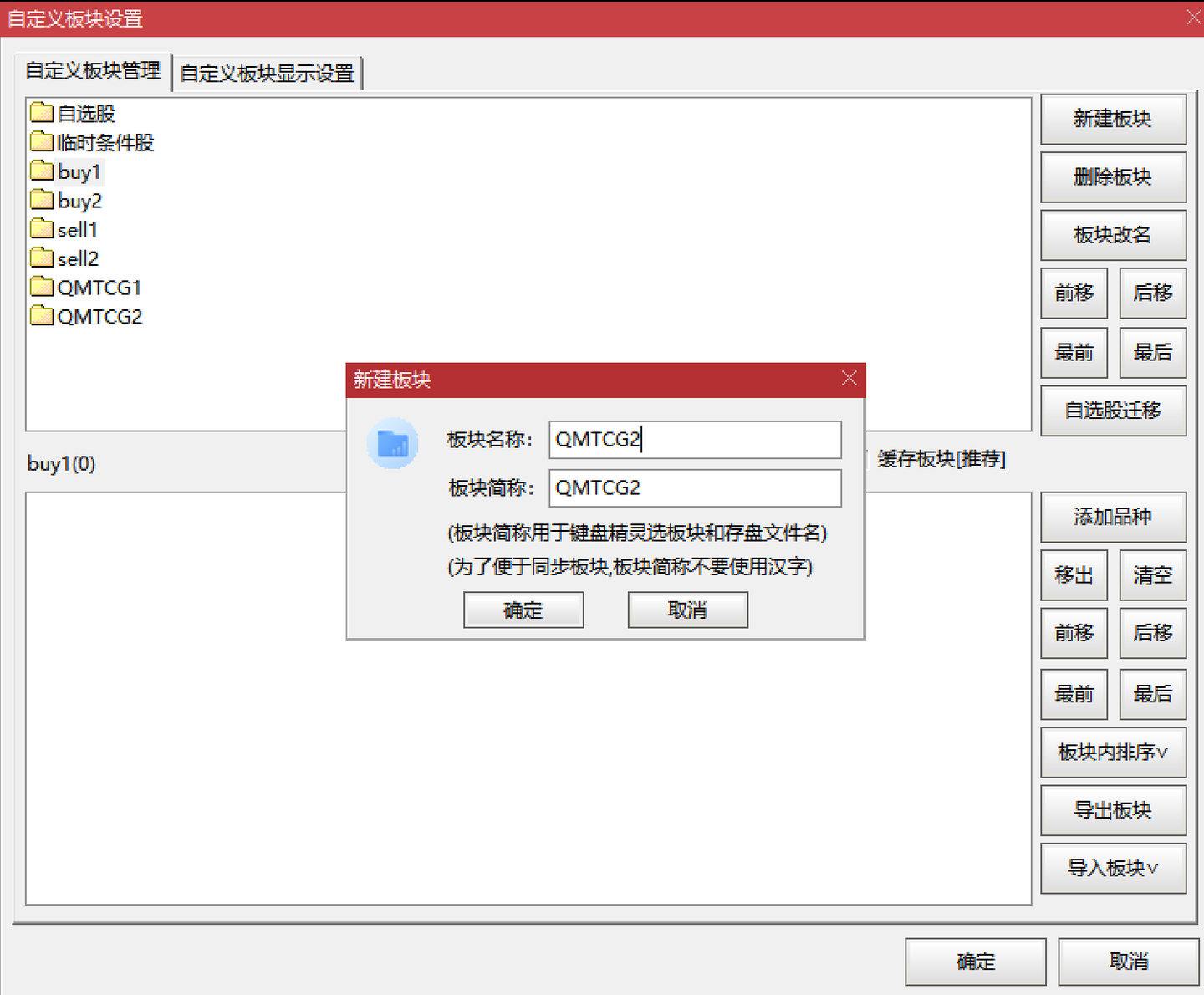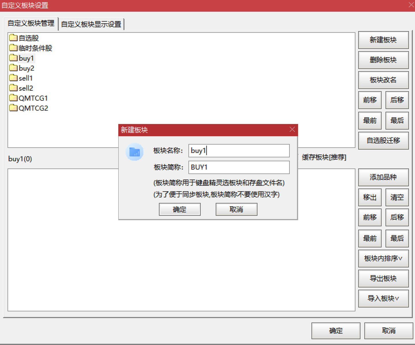 买入板块、卖出板块、同步持股板块尽量一一对应,比如:“BUY1-SELL1-QMTCG1”为一组,“BUY2-SELL2-QMTCG2”为另外一组,一组一组的建立,名称自己改,注意区分,按需自建。