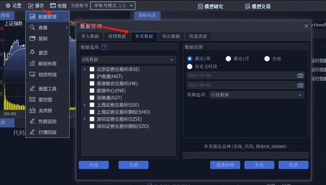 操作步骤:在“操作”——“数据管理”——“补充数据”界面操作,选择补充一个月即可。