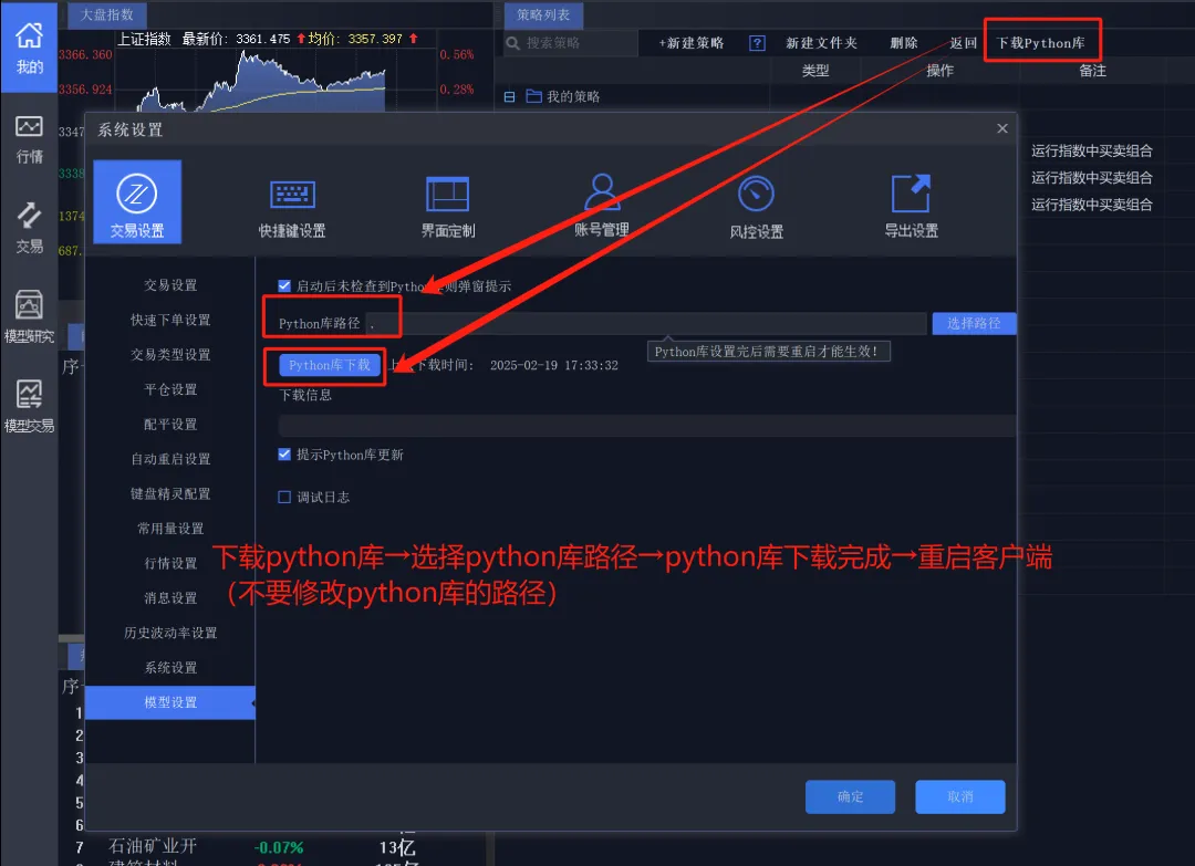 首页→下载python库→选择python库路径→python库下载完成→重启客户端【注意不要修改路径】。