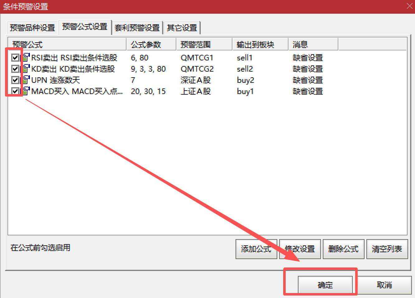 给自己的股票池设置买入预警公式,然后将预警结果输出到之前自定义建立的买入板块中