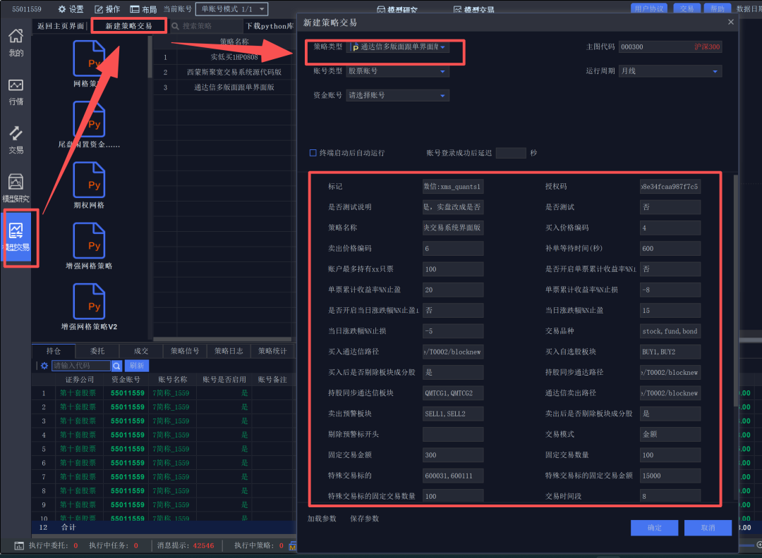 左侧“模型交易”-新建策略交易-选择“通达信多版面跟单界面版.rzrk”,然后选择账号类型与资金账户即可,会自动弹出参数页面。