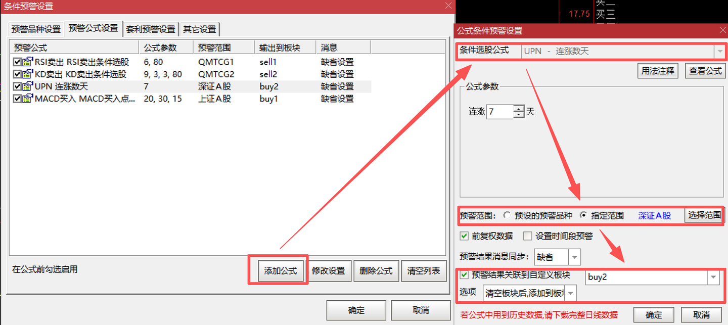 如果你的一个股票池需要匹配多个公式,那就把新公式按同样的步骤再建立一遍即可,但需注意多公式预警同一个股票池的话,预警结果是“或”而非“且”的关系,即股票池中满足公式1或公式2的股票,都会被筛选出来。若需要筛选股票池中同时满足公式1和公式2的股票,建议是在公式编写时把两个公式整合成一个复合公式。
