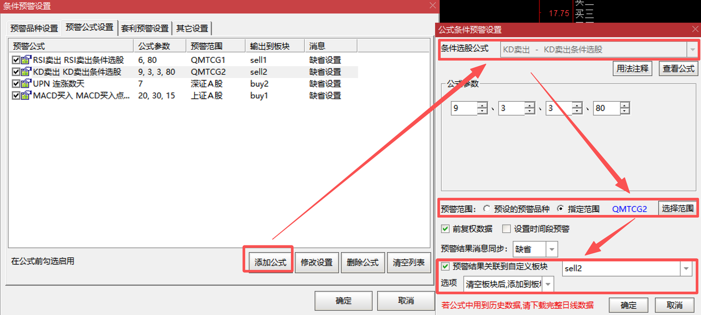 给“QMTCG2”同步持股板块设置了“KD卖出”公式,然后把预警结果输出到了“sell2”板块,即QMTCG2-KD卖出-sell2