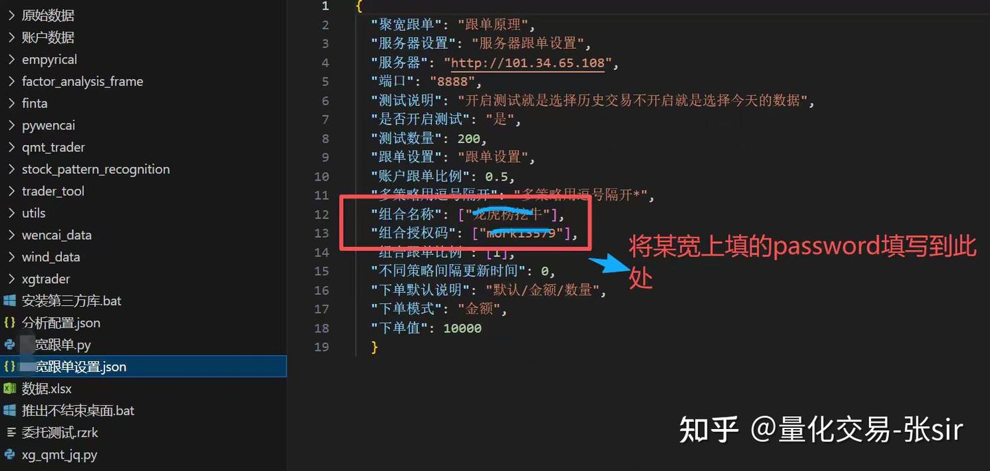 - 在文件中填入组合授权码,确保此处填入的授权码与聚宽策略中的 password 保持一致。如果你想要跟单多个聚宽策略,可以填写多个授权码