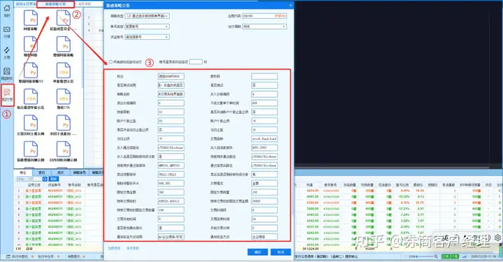 在QMT【模型交易】界面点击“新建交易”,在【策略类型】处选择我们导入的“通达信多板块跟单界面版.rzrk”文件,然后修改参数后保存。