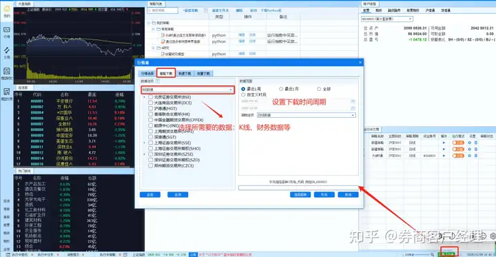 手动下载:在软件界面上,点击右下角行情按钮,进入行情界面,点击智能下载,选择需要下载的数据类型,比如K线、财务数据等;选择需要的时间时间,比如2025年1月1日至今,选择下载数据周期,比如1分钟、5分钟、日线等。
