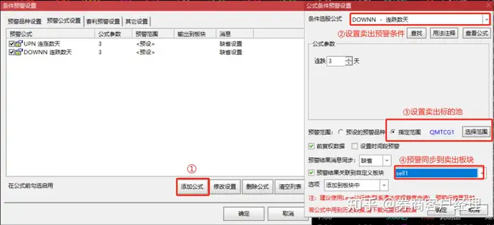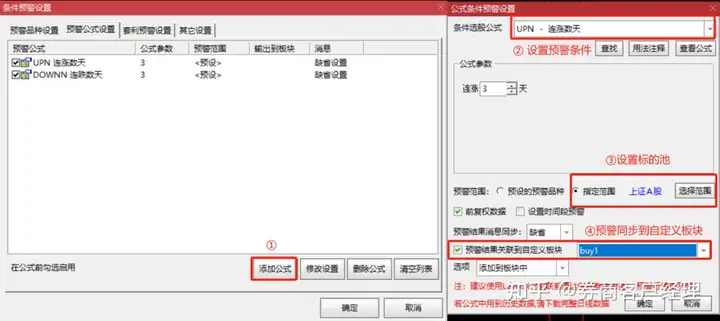 在【预警公式设置】界面,选择【添加公式】,先设置预警条件,再选择标的池,最后设置预警结果输出的板块。
