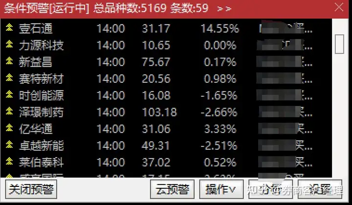 上面的股票池和预警条件都可以自己设置,可以是同一个ETF标的池或者同一个股票标的池设置不同的预警条件,但是预警结果输出记得设置到不同板块,本质就是把买入预警条件结果输出到不同板块中。