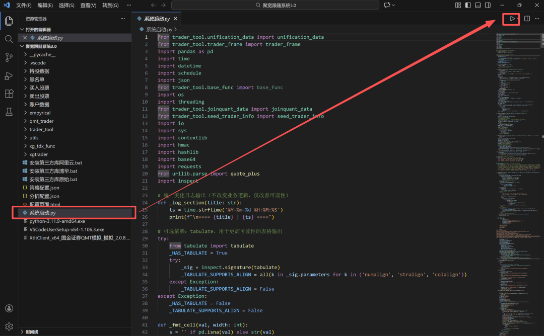 在vscode选中“系统启动.py”文件,并点击右上角运行按钮即可。
