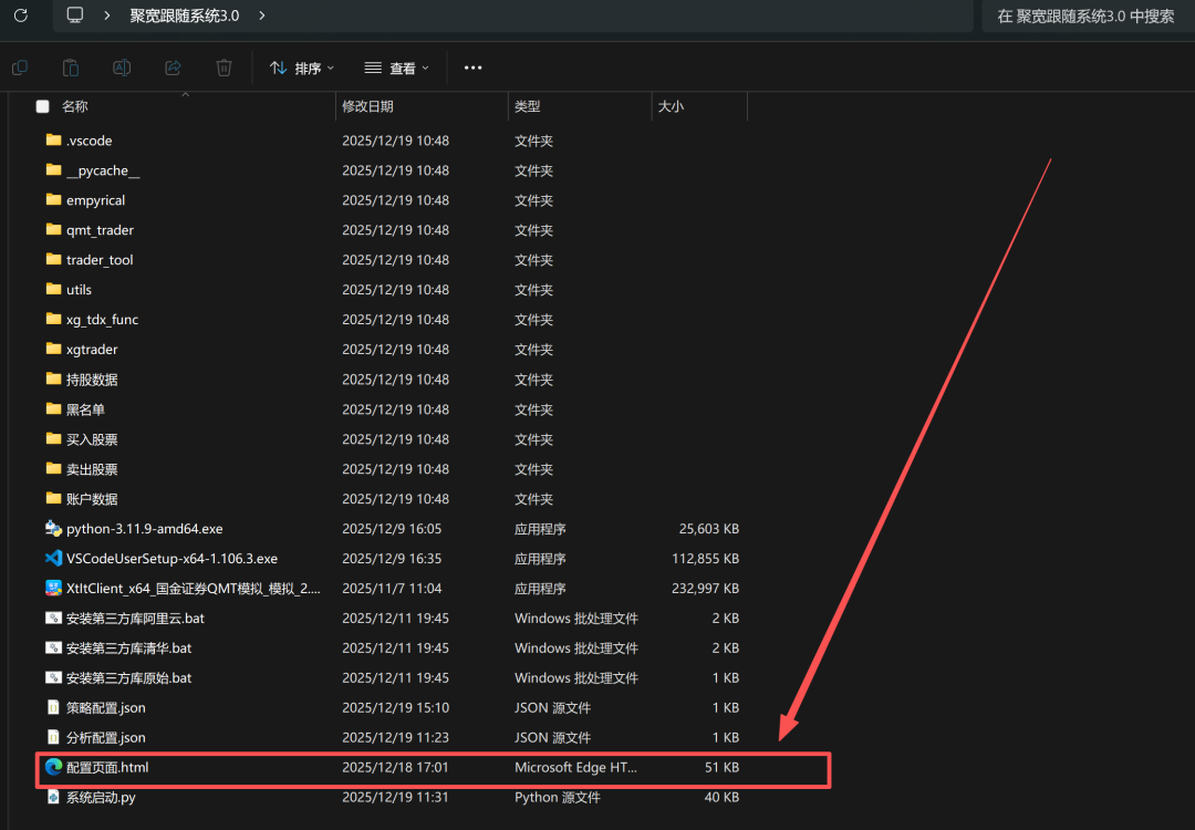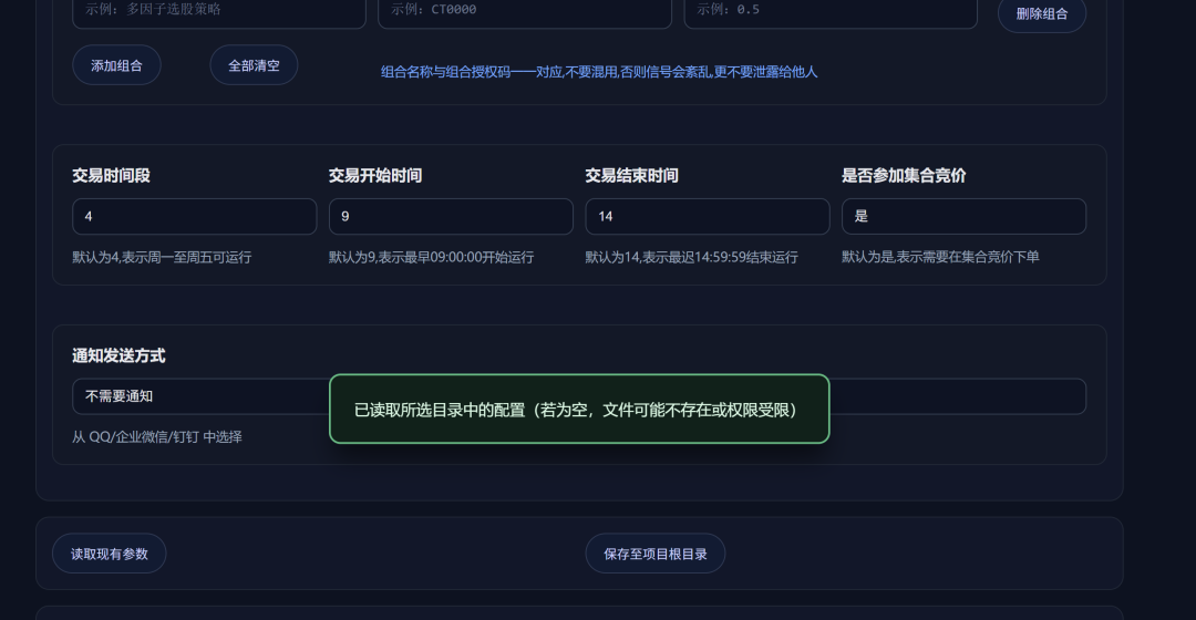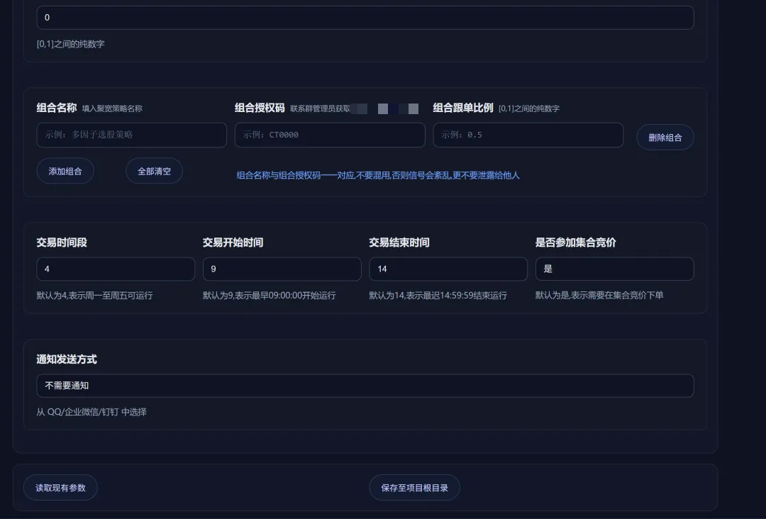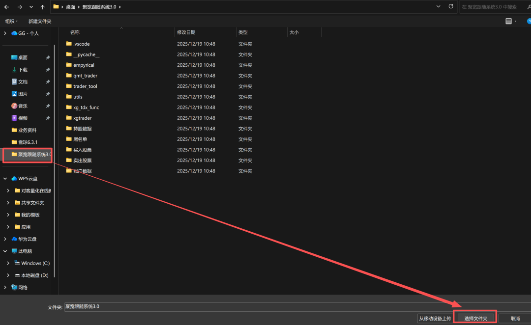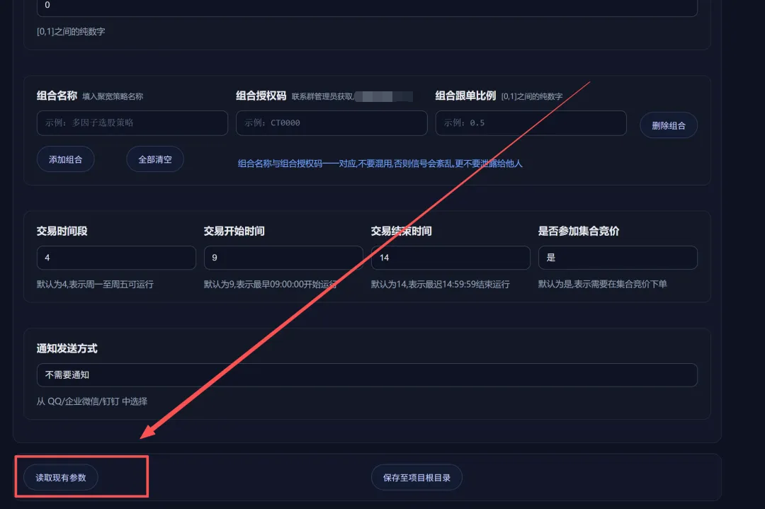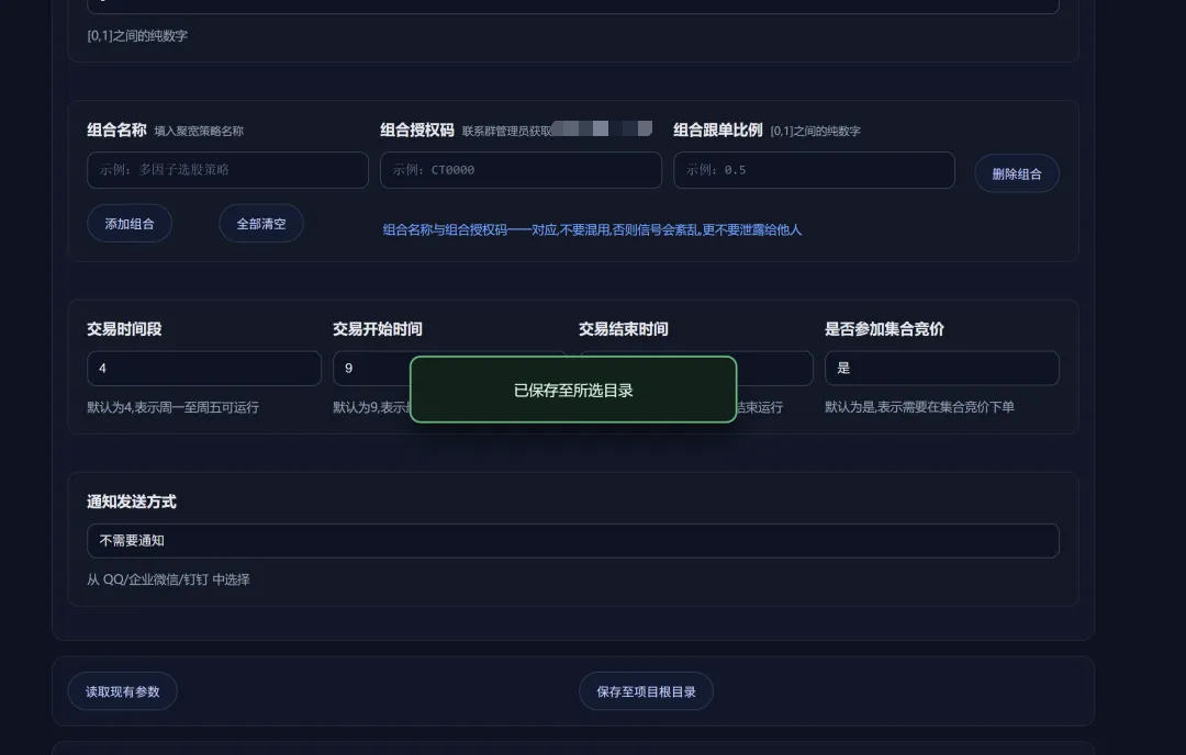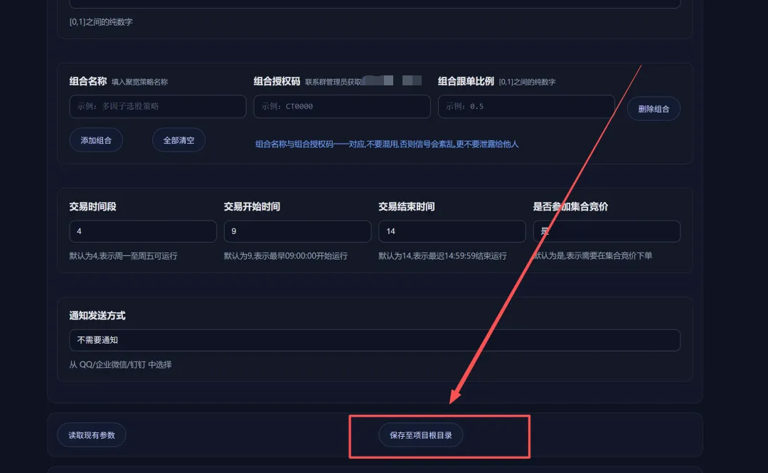 所有参数填好后,点击网页端下面的“保存至项目根目录”按钮,把所填参数保存到“聚宽跟随系统3.0”文件夹中