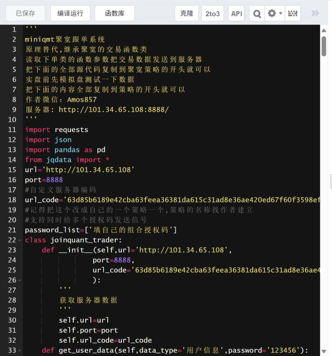 把我们给的这一小段代码复制到自己聚宽策略源码的最前面,并填入自己的组合授权码(password)即可。