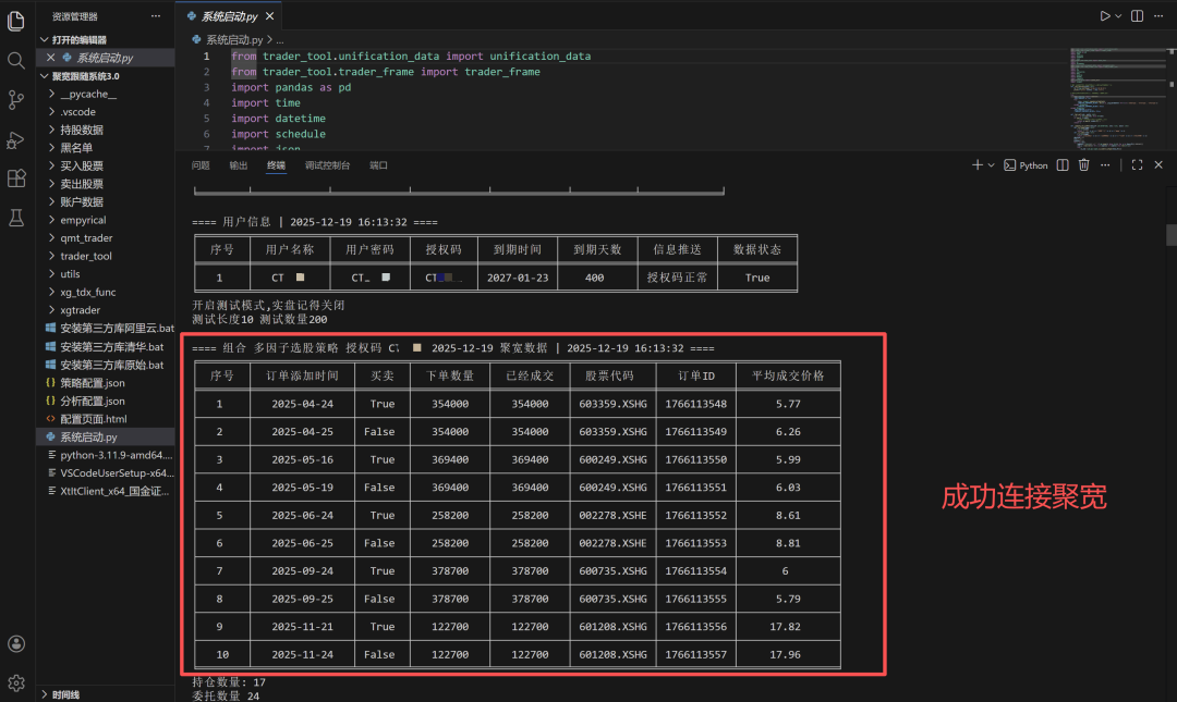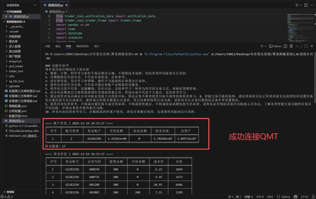 (参数填写保存之后,就可以用vscode运行插件了,记得提前登录qmt)