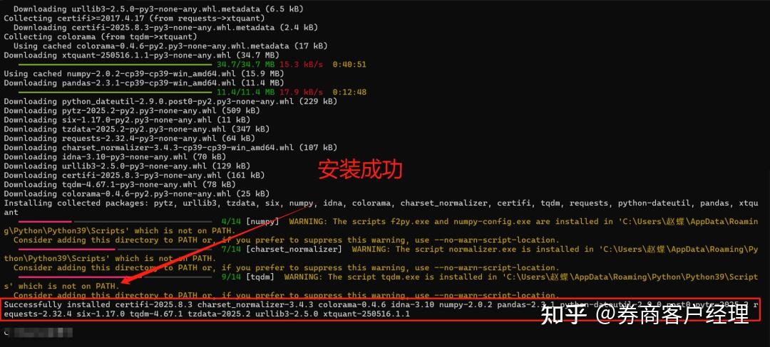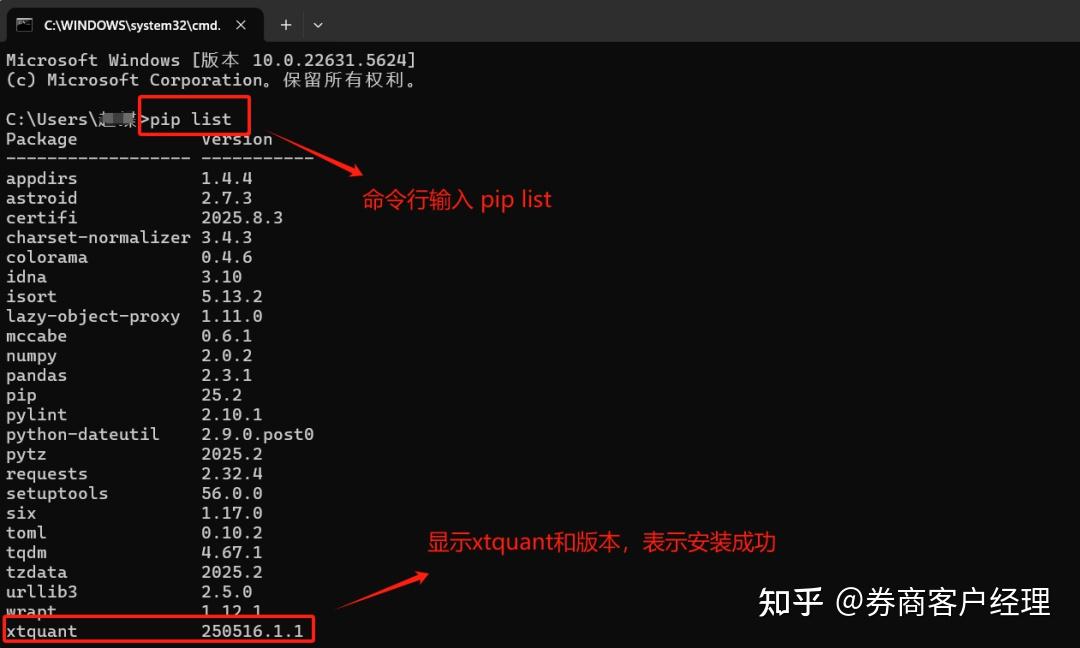 验证一下:在命令行里输入 pip list 看到xtquant的版本就说明安装成功。OK,配置成功!!