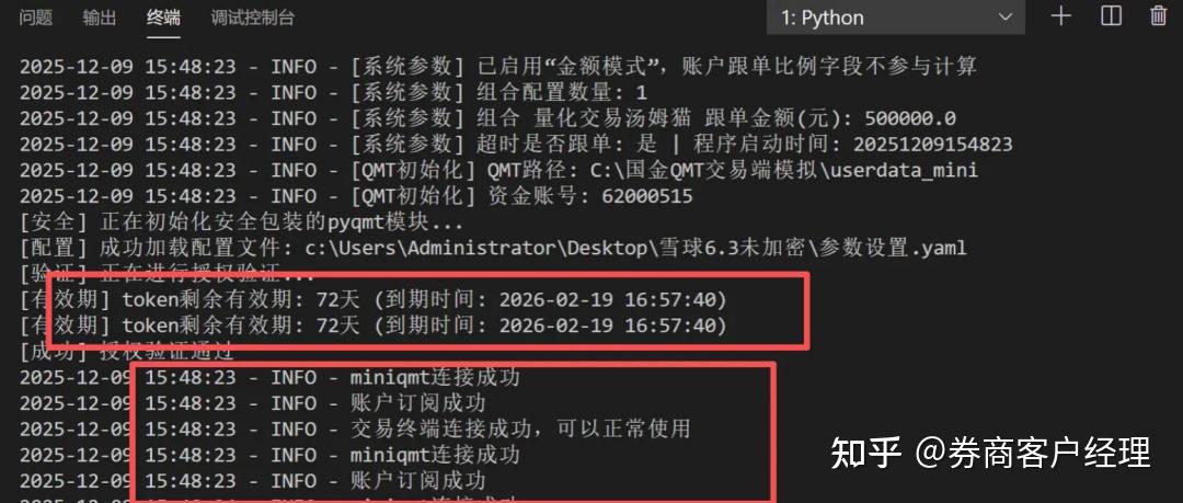 提示miniQMT链接成功、token有效期就是配置成功了,token也是文末联系作者领取。