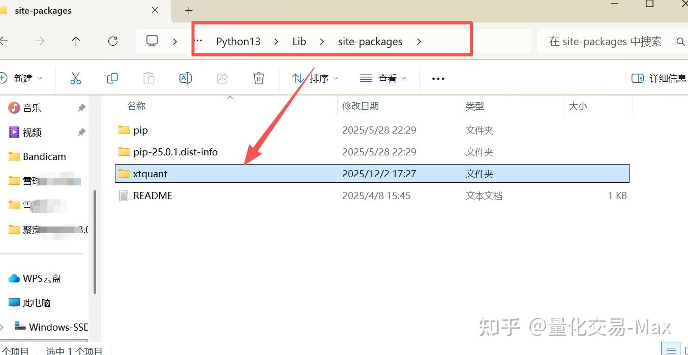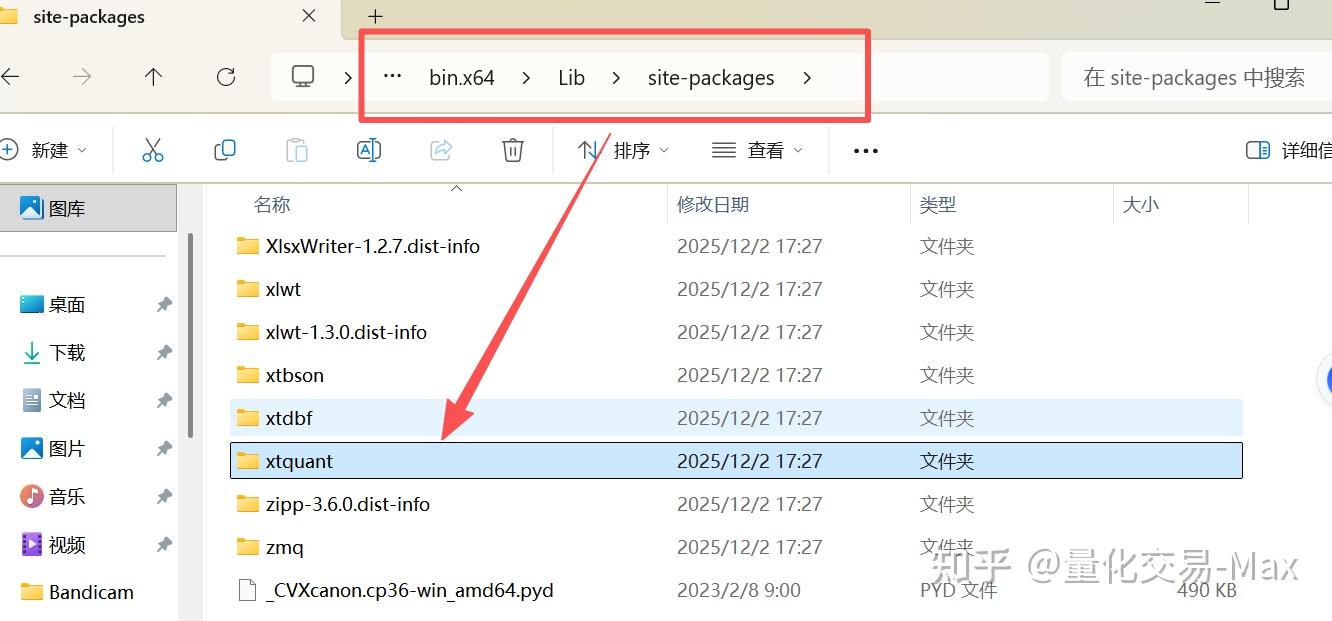 上面的python库下载好之后,xtquant 库就到了你 QMT 的内置 Python 环境里,详细路径在 QMT 安装目录bin.x64 / Lib / site-packages下。